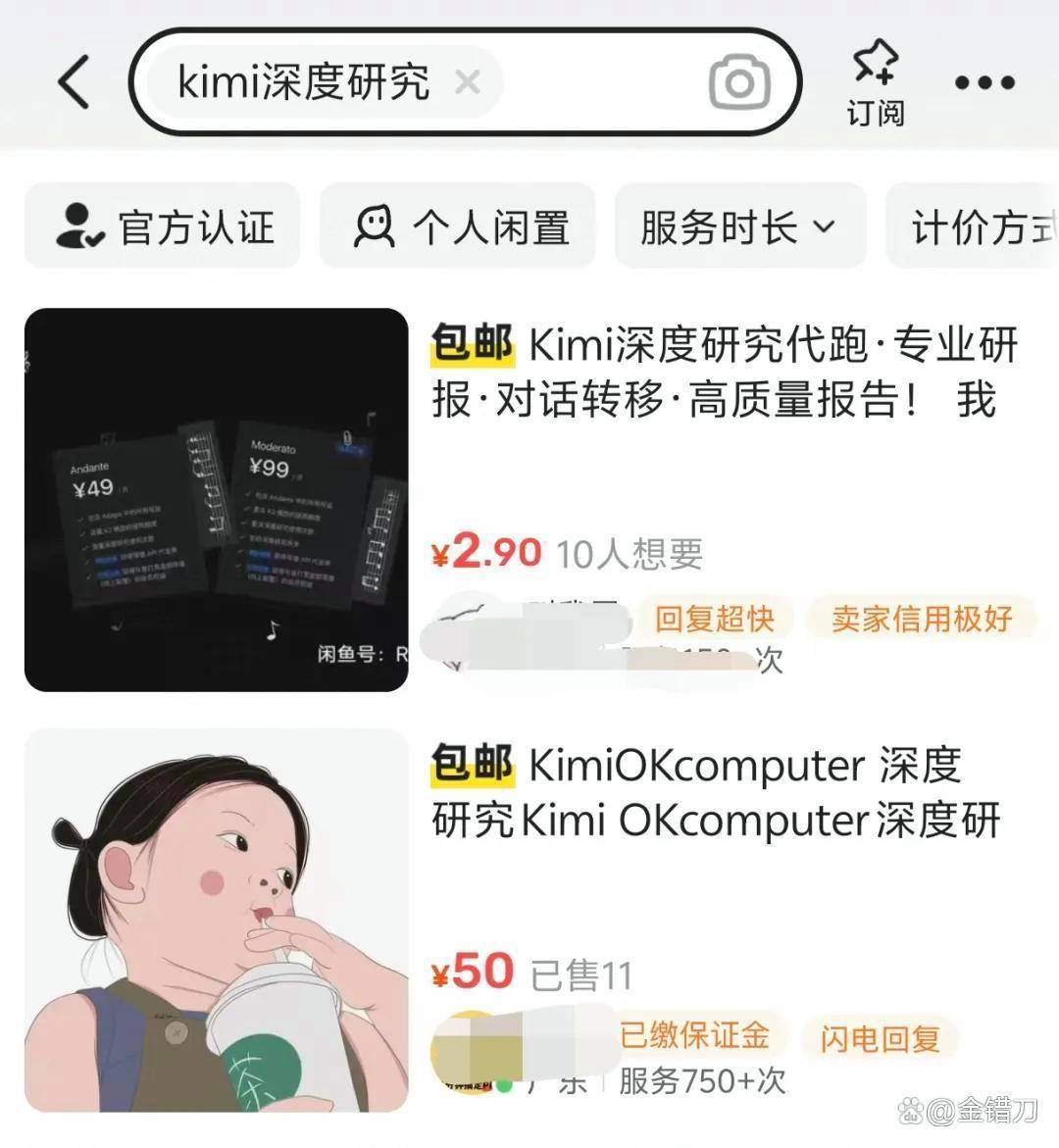 在二手平台上50元的“Kimi深度研究”能卖出近1000份,背后的成本除了Kimi、GPT-5等平台的高级会员,就是调教AI的时间成本。